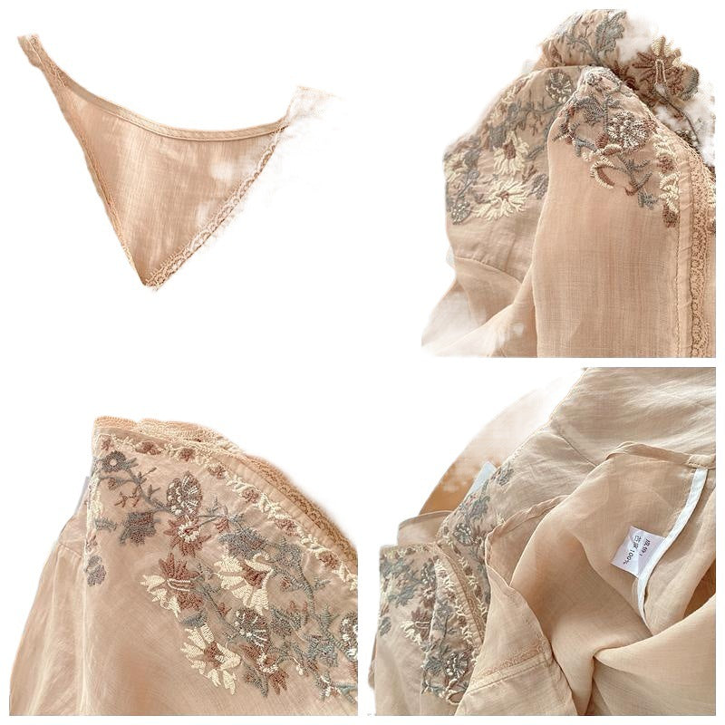 Tencel Cotton Shirt Women Literary Loose v-Neck Pullover Embroidery Medium Sleeve Tops